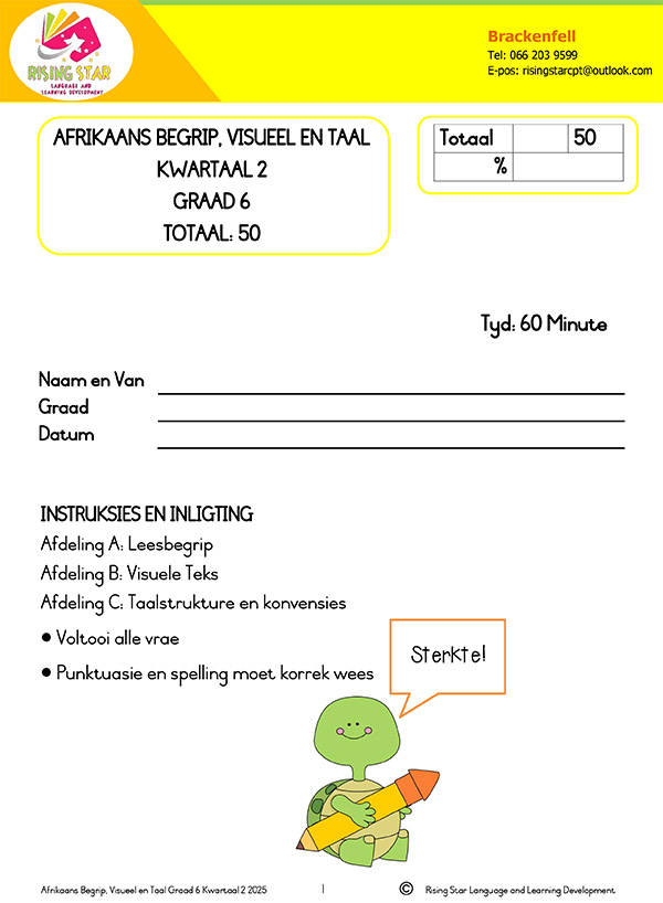 Graad 6: Kwartaal 2 – Afrikaans Begrip, Visueel en Taal Toets & Memo