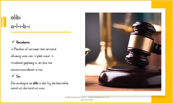Bevat 143 spelwoorde elkeen op sy eie bladsy met die spelling, verduideliking wat die woord beteken en ‘n prentjie.